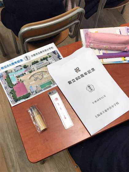 本校の60周年の記念品を本日配布しました。クリアファイル、PTAさんからのものさし、地域からの色鉛筆を渡しました。
