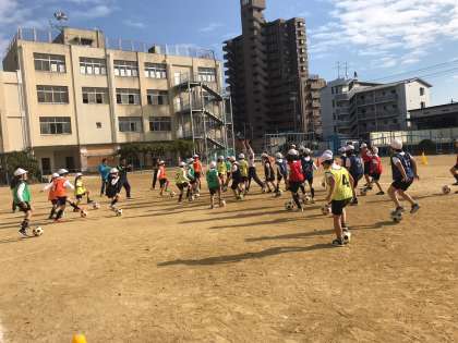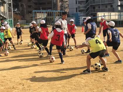 ボールゲームとして、サッカーの研究授業を行ないました。各チームのめあてを確認して、途中でゲームの振り返りをし、作戦を考えて声を掛け合いながらゲームを楽しんでいました。