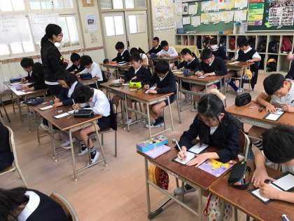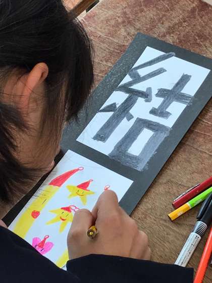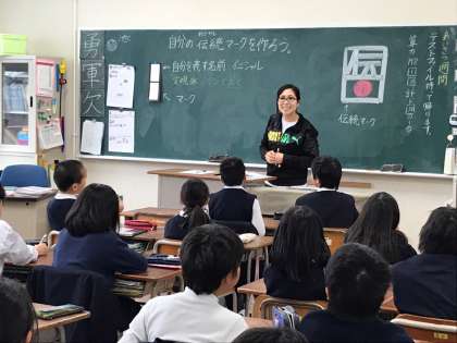 3時間目の社会科で学習した伝統工芸品に刻まれたマークにちなんで、4時間目は、図画工作科で、自分の伝統マークを作成しました。