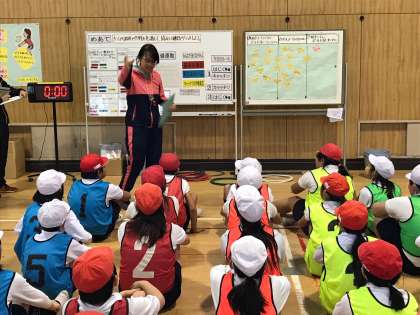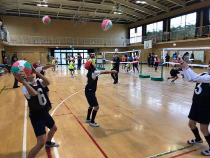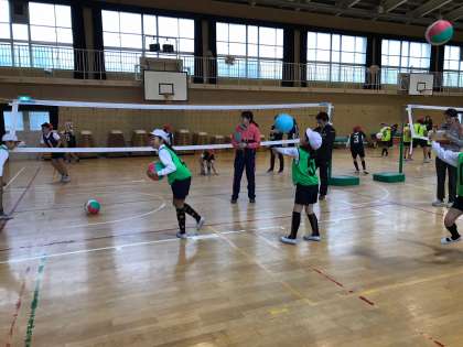 ソフトバレーボールで公開授業をしました。各チーム、作戦を考えゲームを楽しんでいました。
