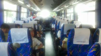 バスの中では、バスレクが始まっています。みんなシートベルトを着用して安全に楽しんで、ハチ高原へ向かっています。