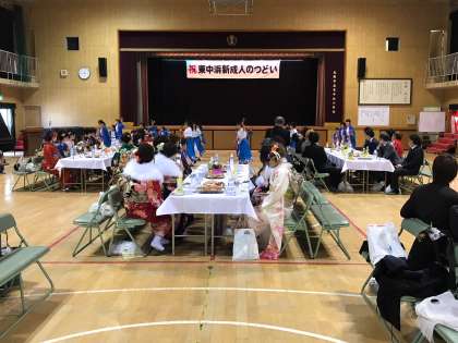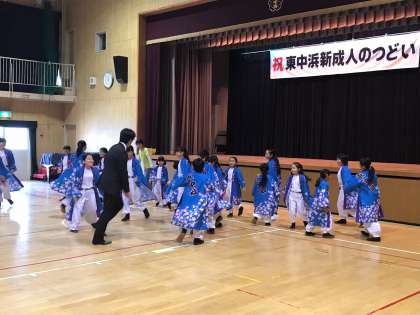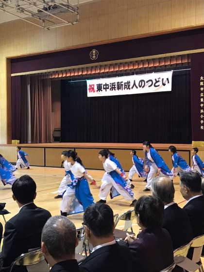本日、区民ホールでの成人式のあと、新成人の皆さんが久しぶりに母校に集まりました。オープンニングでは、本校子どもたちが参加するチームさくらが、よさこいソーランを披露しました。新成人も飛び入り参加しました。そして、タイムカプセルに入った8年前に書いた自分への手紙を開封したりと、楽しいひと時を過ごしました。