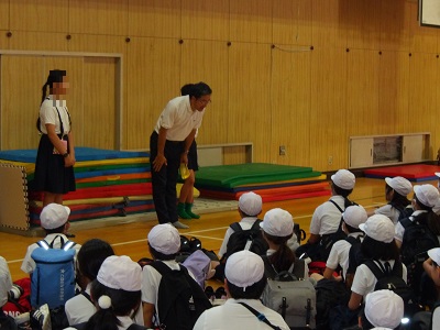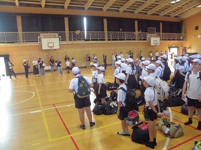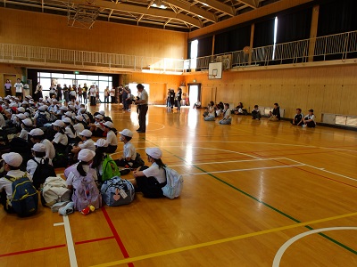 児童は朝7時30分〜50分に登校し、講堂に集まりました。