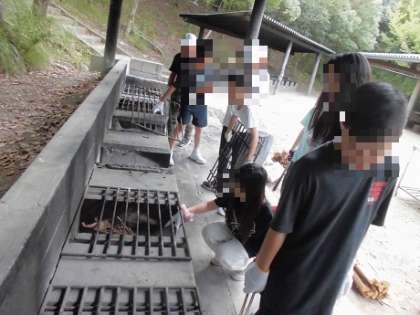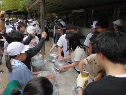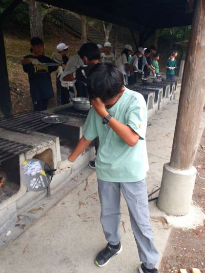 カレー自体の調理は、夏休みの宿題で練習済みですが、火おこしはそう簡単にはいかなかったようです。苦戦しながらもなんとか薪に火をつけることができました。