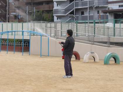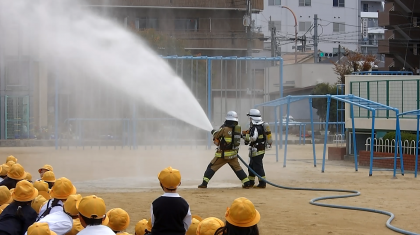 実際に、教職員が消火器の実演をしたり、消防士さんから放水訓練の様子を見せていただきました。