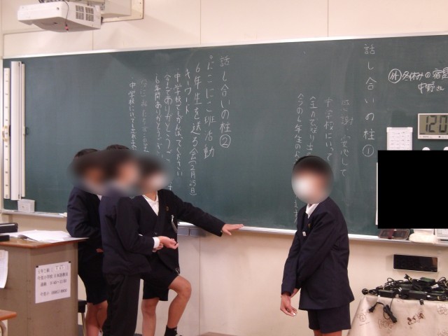 二教室に分かれて活動しました。6年生は近々行われる「あいさつ運動」についての段取り。4,5年生は「6年生を送る会」の段取りを計画していました。