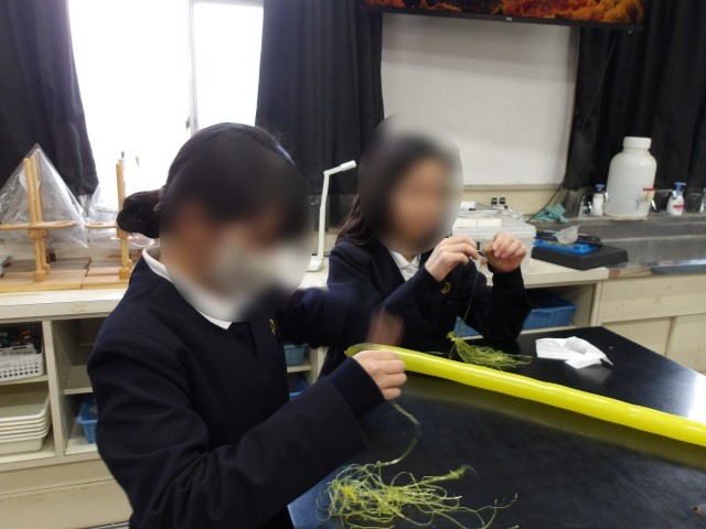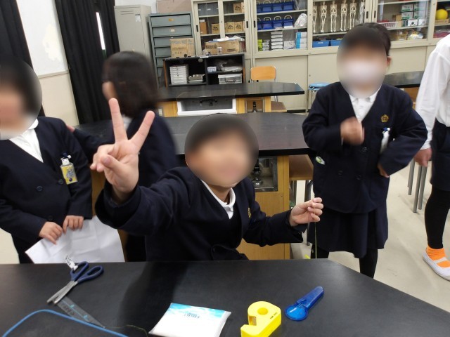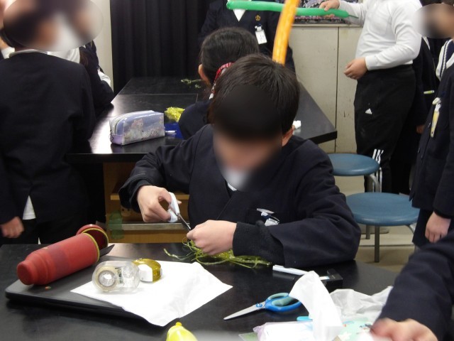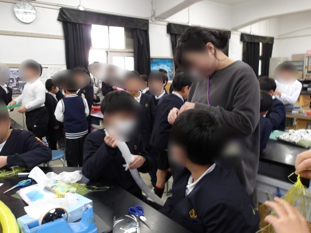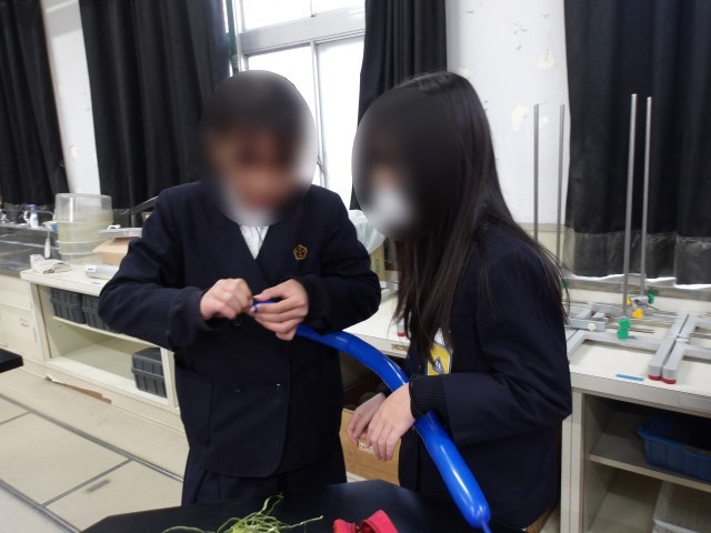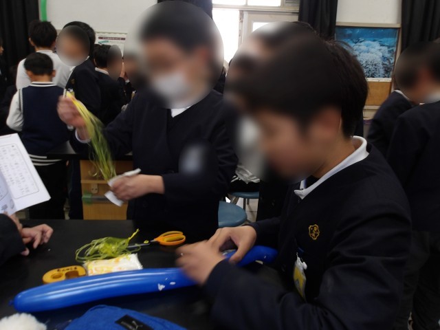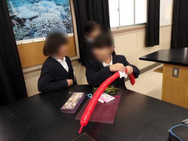 風船を膨らませて擦っています。スズランテープが何やら空中に・・・。