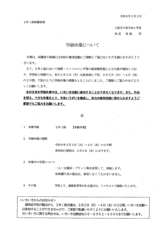 2年1組において、発熱、インフルエンザ等の風邪様疾患による欠席が増加しており、学校医と相談の上、本日2月2日(月)は給食終了後13時40分に下校させ、3日(火)、4日(水)は、学級休業の措置をとることとしました。