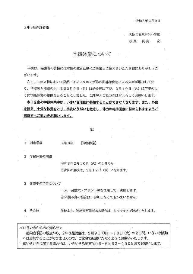 2年3組において、発熱、インフルエンザ等の風邪様疾患による欠席が増加しており、学校医と相談の上、本日2月9日(月)は給食終了後13時40分に下校させ、10日(火)は、学級休業の措置をとることとしました。(次回の登校は2月12日(木)となります。)