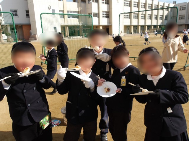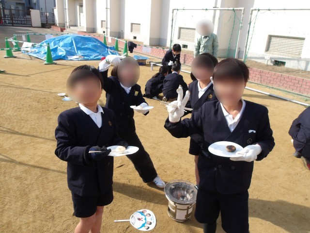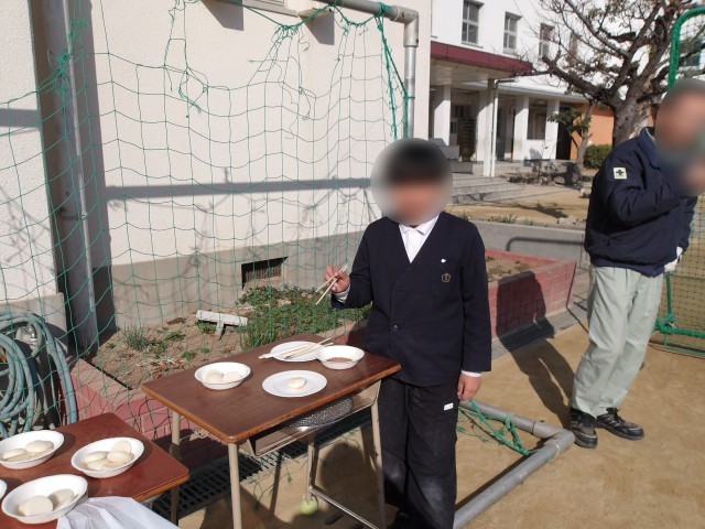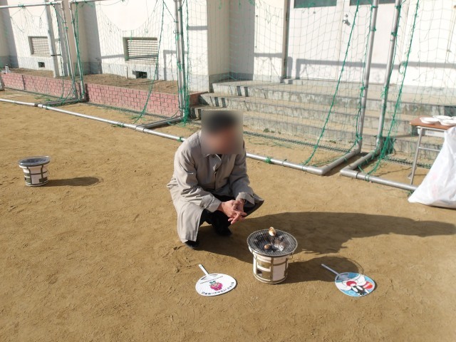 火おこしは、管理作業員さんと職員室の先生で行いました。子どもたちは七輪の小窓からうちわで風を送り、火の調節をしながらお餅を焼きました。