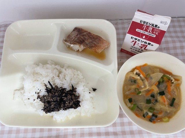ひじきと牛ひき肉を炒めて味付けしただけのそぼろ煮ですが、とてもごはんに合い、児童に好評の献立です♪