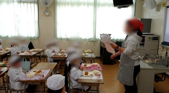 お箸の持ち方、給食の配膳方法、牛乳パックの開け方、順番に主食、主菜、副菜を食べる等、1年の担任から細やかに指導が行われています。