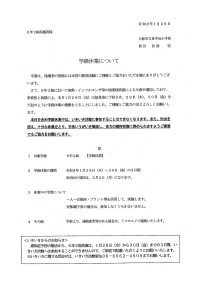 6年2組において発熱、インフルエンザ等の風邪様疾患による体調不良児童が増加しており、学校医と相談の上、本日1月28日(水)は給食後13時40分に下校させ、29(木)、30日(金)を学級休業の措置を...