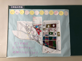 昨日の校区探検で見たことを、みんなで地図にまとめました。