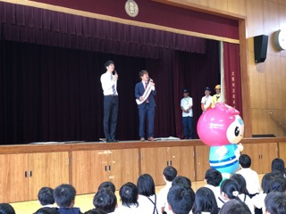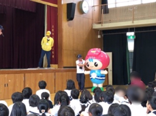 安パト(城東区安全パトロール)のみなさんとコスモちゃん、城東区住みます芸人のアンプリ(アンリミテッドプリパレーション)のお二人が来校され、登下校時や外で遊ぶときなど防犯に関するお話をしてくださいました。