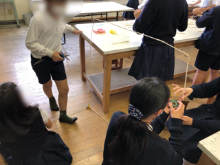 算数の学習で計算はして答えは求めているけれど、実際はどのくらいの大きさなのか、実際に作って確かめることにしました。わりばしをつなげてグループごとに協力して作りました。