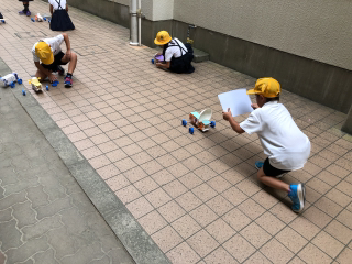 生活の授業で作った《風で動くおもちゃ》です。友だち同士で風を起こし、競走させたり、一緒に走らせたりして楽しそうでした。