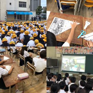 今回は「大阪湾で大規模な地震が発生し、津波の発生に備えてより安全な場所に避難する」という想定でした。1年生から6年生まで先生の指示をよく聞いて、素早く避難することができていました。