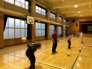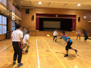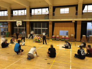 児童の下校後、講堂でボール運動の研修会を行いました。
