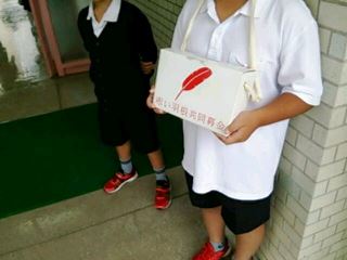 登校時に児童会で《赤い羽根 共同募金運動》を行っています。