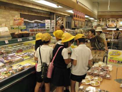 3年生が蒲生4丁目交差点付近にある関西スーパーと、城東商店街に社会見学に行きました。スーパーでは、どんな品物があるか、どういう具合に陳列されているか、お客さんの様子はどうかなど、熱心に見学していました。