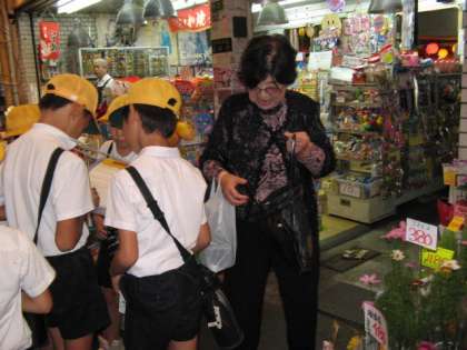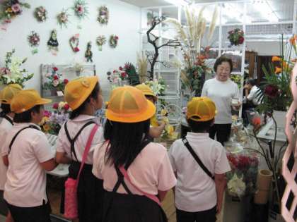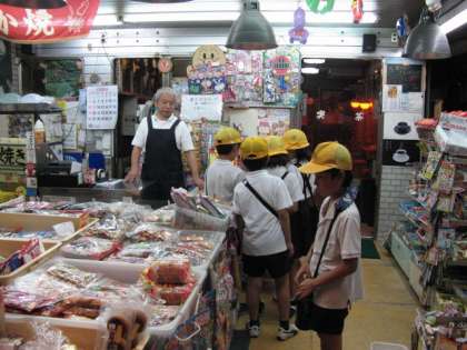 城東商店街では、班に分かれて、花屋・あられ屋・おかし屋などいろんなお店にインタビューに行っていました。どんな物が売れるのか、何時までやっているのか、お客さんはどの辺りから来られるのかなど、お店の方に熱心にたずねていました。