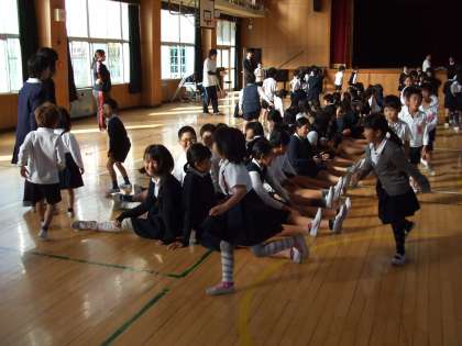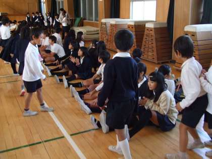 10月30日の朝、1年生と6年生のペア学年集会をおこないました。代表委員の児童が説明をしたあと、椅子取りゲームの要領で1年生と6年生が交流をしました。