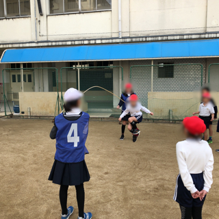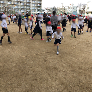 高学年の児童がなわを回して、順番に跳びます。低学年の児童の中には、回っているなわに入るタイミングがわからなかったり、怖がったりしてうまく跳べない子も見られましたが、跳ぶことができるように高学年の児童がやさしく声掛けをしていました。