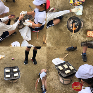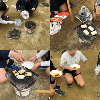 3年生は『七輪』を使って、おもちを焼く体験をしました。