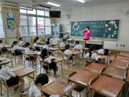 担任の先生は、学校生活を始めるにあたり、どうすればよいかをていねいに説明し、子どもたちも一生懸命聞いていました。