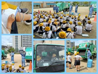 16日(木)2時間目に、4年生は社会科の体験学習として、大阪市城北環境事業センターの方々にお越しいただき、《ごみ収集車(パッカー車)》についてお話を聞き、体験も行いました。