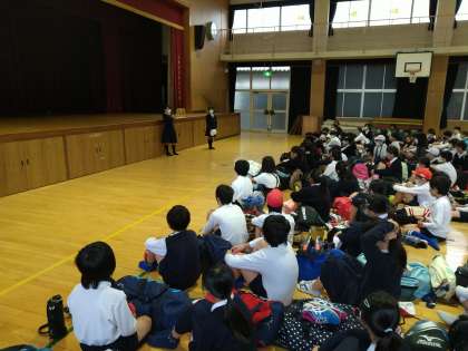 8日(木)7:30、講堂で『出発式』を行いました。あいさつのあと、校長の話、児童代表のことば