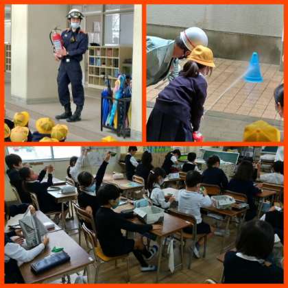 その後は、各学年ごとに、水消火器の体験、紙食器づくり、救急救命訓練、映像による防災学習(NHK for schoolの映像を用いて)などを行いました。