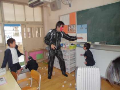長身の男の先生に鬼役を頼み、子供達は鬼に向かって「鬼は外、福は内」を言いながら