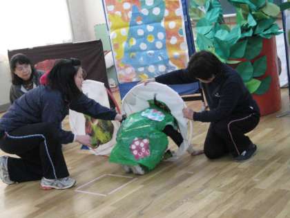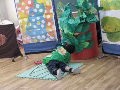 衣装や舞台背景も、とても凝ったもので、子どもたちはあおむしさんになりきって、演技をしていました。後で感想を聞くと、劇ができて、楽しかったとのことです。また、やりたいと言っている子もいました。力の入った熱演でした。