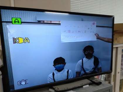 今日の全校朝会で、学級代表の児童がプチ運動会のスローガンを発表しました。
