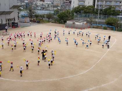2年生は、はじめてポンポンを持って練習しました。