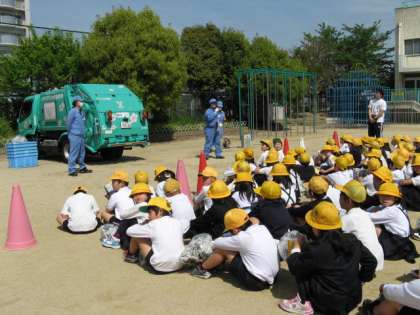 大阪市衛生局からパッカー車を運転して来ていただき、子どもたちに環境について、授業をしていただきました。子どもたちは家庭から、ごみを作って持って来て、実際にパッカー車の中に入れてみる体験をしていました。