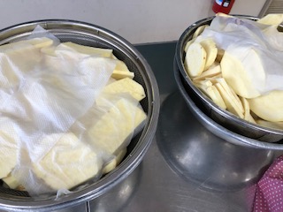 輪切りにした黄色のさつまいもを、ホットプレートに並べて、お箸でひっくり返しながら焼きます。