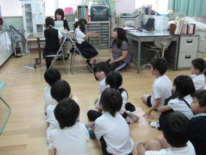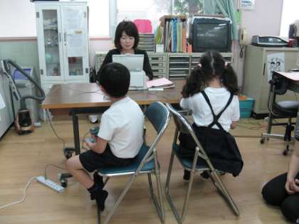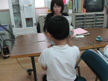 子どもたちは、両耳にヘッドフォンをつけて、かすかな音を聞き取ります。音の大きい・小さい、高い・低いを聞き取って、聞こえているかを調べました。子供たちは皆、真剣に検査を受けていました。