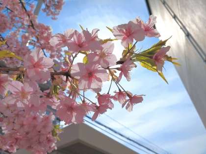 1年生の教室横の、早咲きの桜の木が満開になっています。