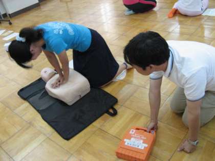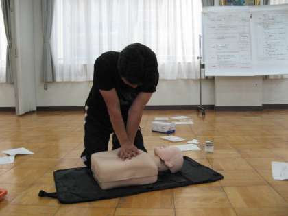 あってはならないことですが、もしもの時のために、皆、真剣に講習を受け、練習用の人形を使って、実習をしました。毎年、講習会に参加して、人工呼吸や心臓マッサージなど、救急救命の技能を高めています。