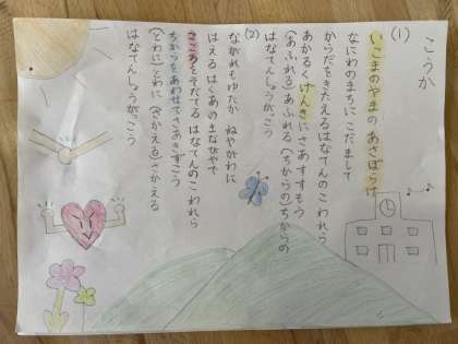 6年生がお手本で歌ったり、歌詞をプリントに書いたり、工夫して優しく教えてくれました。
