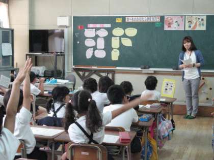 黒板にたくさん食べ物のカードが貼られ、資料を見ながらの楽しい授業をしていただきました。子どもたちも、興味津々で食べ物について、考えていました。