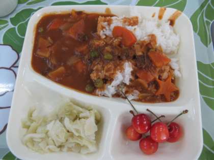 先日、ハヤシライスとキャベツのゆずドレッシング、さくらんぼという献立がありました。