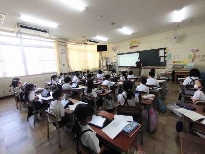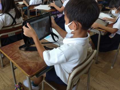 一人一台端末を使って、夏休みの思い出を発表する準備をしていました。