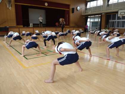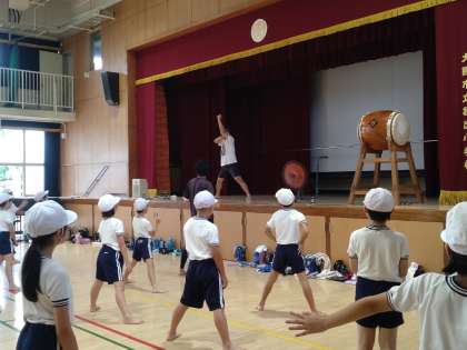 「1,2,3,4!」と拍に合わせて、先生の動きをよく見て、振りを確かめていました。