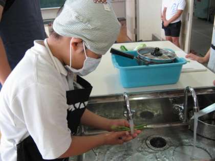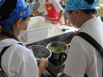 率先して活動する子、こわごわ包丁を握っている子、緊張して鍋の番をする子などなど、皆、よい経験をしていました。その後、自分たちで作ったサラダをおいしくいただきました。