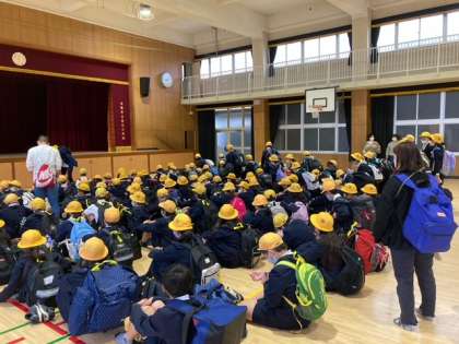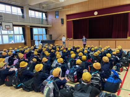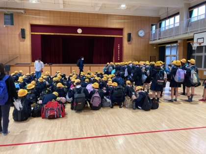 あいにくの雨ですが、5年生の児童のみなさんは元気です。