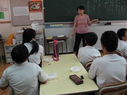 1学期の終わりに、たんぽぽ学級でお楽しみ会が開かれていました。七夕の後だったので、「七夕」の歌を歌い、皆で世話をして、学習園で作った枝豆を使ったおむすびと、ジャガイモのソティーの調理実習を行いました。